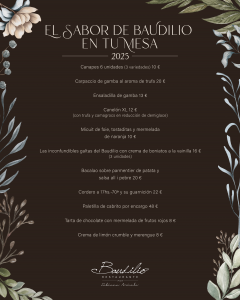 La cocina del restaurante Baudilio esta marcada por la temporalidad de los productos que en su gran mayoría son de cercanía, algunos directamente de la huerta a nuestra cocina, esto gracias al apoyo y colaboración que recibimos de productores de la zona. Sentimos un respeto absoluto por el producto lo cual hace que nuestros menús y carta estén en constante movimiento a la espera de lo que las distintas estaciones del año nos ofrecen.